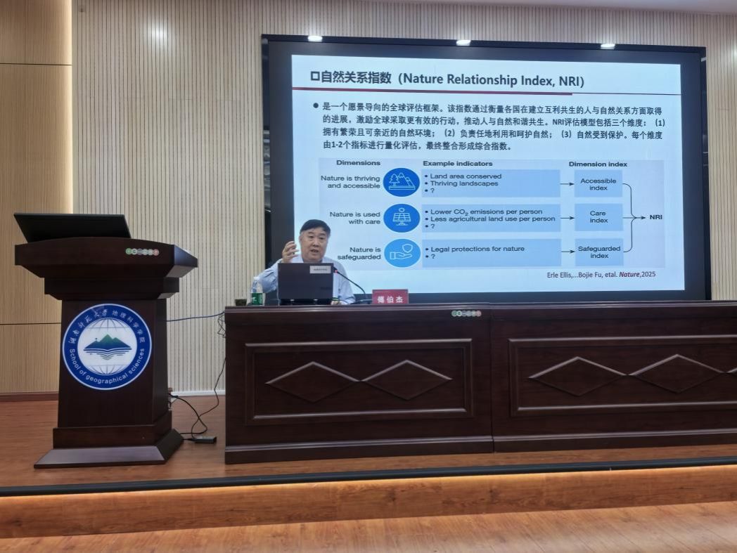 傅院士结合丰富的实证研究案例,详细展示了地理学与景观生态学交叉融合所产生的创新活力与实践价值。他特别介绍了在自然关系指数构建、黄土高原生态恢复与治理等前沿领域所形成的综合研究框架与成果,使与会师生对地理学的实际应用有了更为直观和深刻的理解。基于当前学科发展趋势,傅院士进一步提出,未来地理学应更加注重从综合性与宏观性视角出发,探索复杂人地系统的作用机理与优化路径。