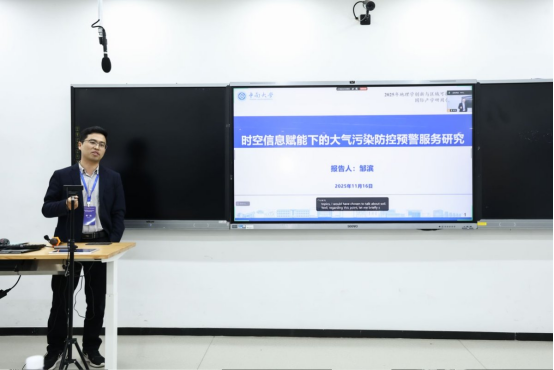 主题报告环节精彩纷呈,七位国内外专家学者依次登台,围绕信息地理学及相关交叉领域的前沿议题分享研究成果、交流深度思考。中国地质大学(武汉)王伦澈教授聚焦人工智能发展浪潮,作了题为《AI时代行业特色院校地理学发展思考》的报告,深入探讨了AI技术赋能下行业特色院校地理学的发展定位、学科融合路径与创新突破方向。澳大利亚弗林德斯大学关华德教授通过线上方式参会,分享了题为《土壤—植物连续体水力参数化与模拟的水势连续监测》的研究成果,展现了该领域的国际前沿探索。爱尔兰戈尔韦大学张朝生教授以《尊重研究中的空间异质性》为题作报告,着重强调地理学及环境科学研究中空间异质性的核心价值。中南大学邹滨教授以大气污染精准治理的现实需求为切入点,带来《时空信息手段赋能下的大气污染防控预警服务研究》报告。针对大气污染精准治理痛点,他团队研发的专项服务平台实现了污染防控预警的精准化、智能化,为实战化治理提供了有力支撑。同济大学王群明教授作《遥感数据融合重建与解译》主题报告,直面遥感数据缺失、分辨率不足等行业共性难题,系统提出多项融合重建与智能解译技术方法,为提升遥感数据应用效能提供了创新思路。中国地质大学(武汉)禹文豪教授聚焦地理信息领域大模型研发,作《MapGPT 大模型的构建框架、方法及应用》报告,从技术框架、核心研发方法到典型应用场景,全面解析了MapGPT大模型的创新价值与实践潜力。我院万义良教授汇报《顾及时空耦合关系的数据插补》研究。针对观测数据缺失这一关键问题,提出了双向时空耦合图网络及顾及时空异质性的STHCGN方法,并对由薄云引起的遥感影像信息缺失,提出了一种基于时序光学影像辅助的薄云去除方法。这些方法为提升数据完整性与可用性提供了高效解决方案。