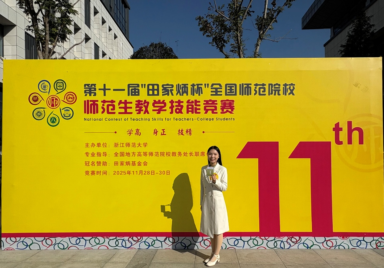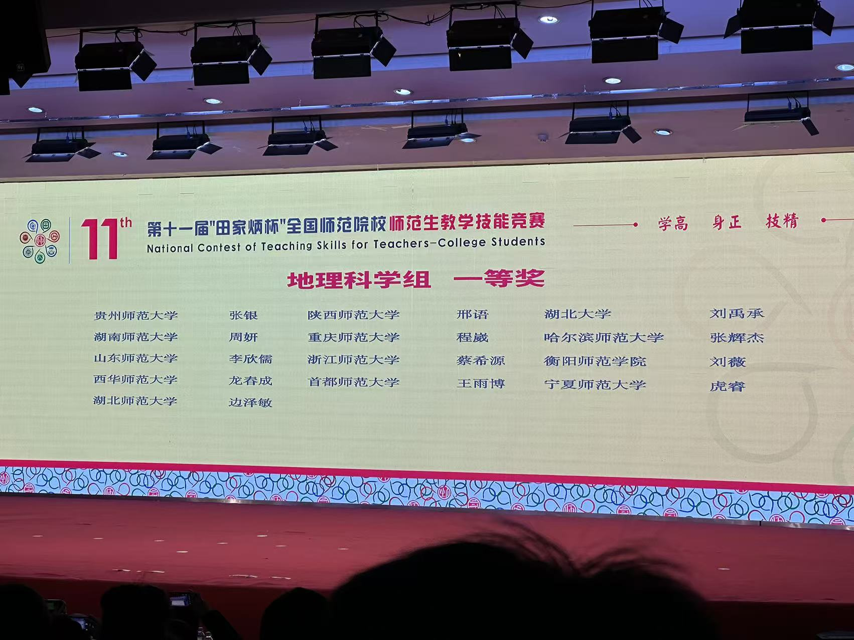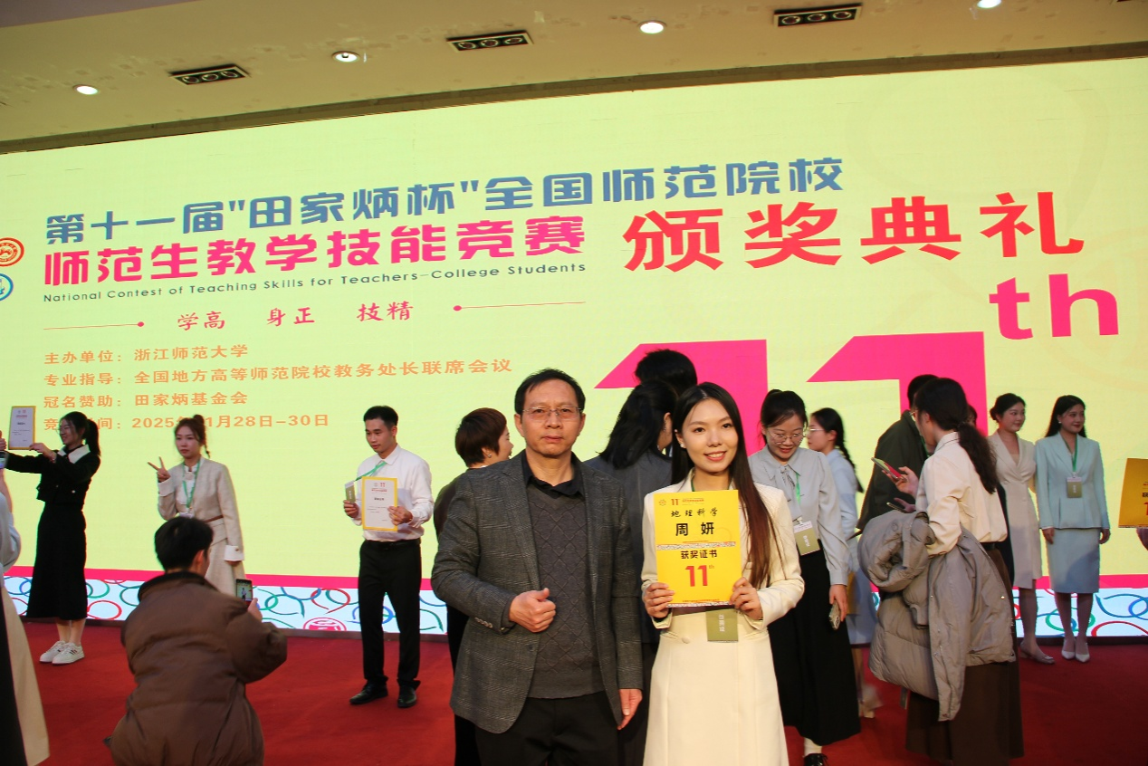 (供稿 熊永欣)11月28日至30日,第十一届“田家炳杯”全国师范院校师范生教学技能竞赛决赛在浙江师范大学举办。作为全国师范生教学技能领域的重要赛事,本次大赛吸引全国178所师范院校的优秀学子齐聚决赛现场,切磋教学技艺、展示专业风采。最终,由我院邓楚雄教授指导的2022级地理科学(师范)专业学生周妍,凭借稳定发挥脱颖而出,荣获地理科学组一等奖。