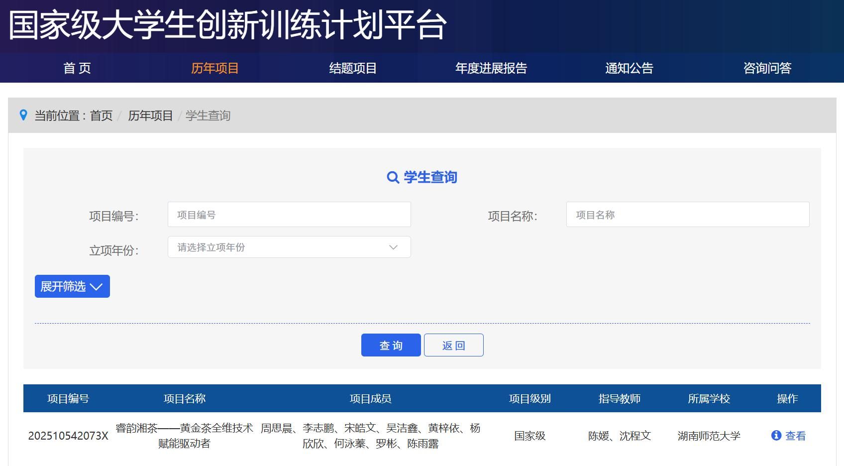 (供稿 周思晨)近日,教育部高等教育司公布2025年国家级大学生创新创业训练计划项目名单,我院申报的“睿韵湘茶——黄金茶全维技术赋能驱动者”项目成功入选。