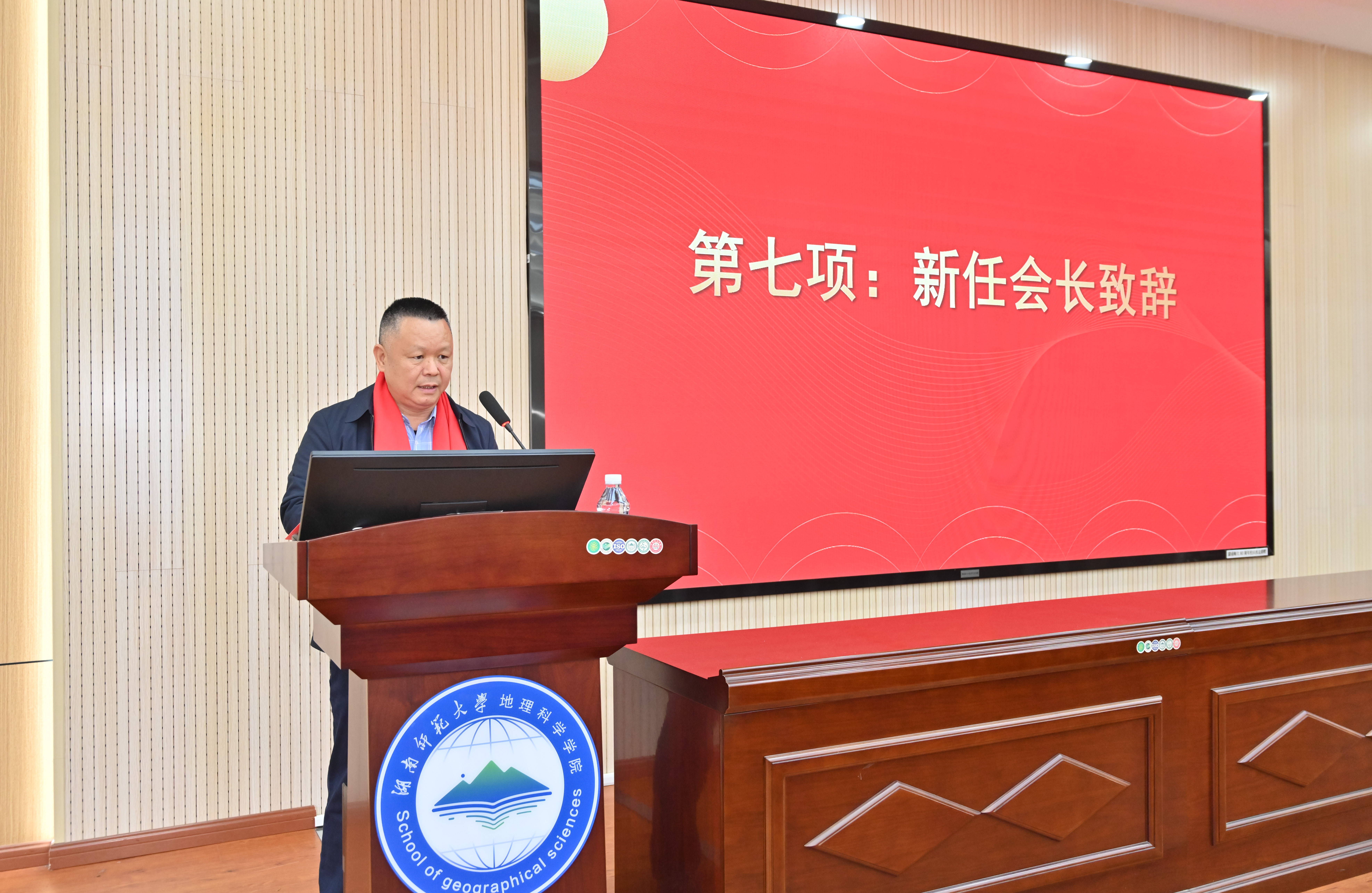 周国华代表学院讲话。他向新一届校友会领导班子致以热烈祝贺,向长期关心支持学院发展的各位校友表示衷心感谢,并详细介绍了学院2025年在学科建设、人才培养、科研创新、社会服务等方面取得的成就。他强调,这些成绩的取得,离不开历代地理人的薪火相传和广大校友的鼎力支持。同时,他结合学科特点,鼓励校友们依托地理学专业素养,在各自岗位上传承学院精神,绽放专业价值,并希望校友会成为“情感的港湾、发展的平台、传承的纽带”,推动学院与校友双向奔赴、互利共赢,为学院“双一流”建设添砖加瓦。