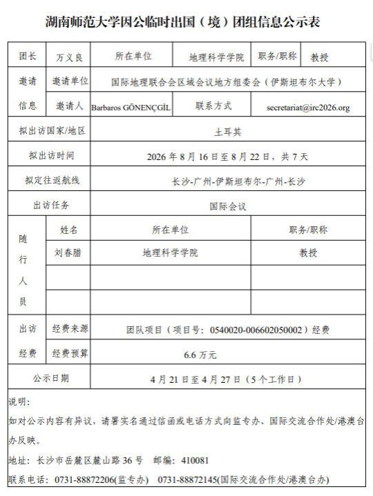 湖南师范大学因公临时出国(境)团组信息公示表 (万义良)