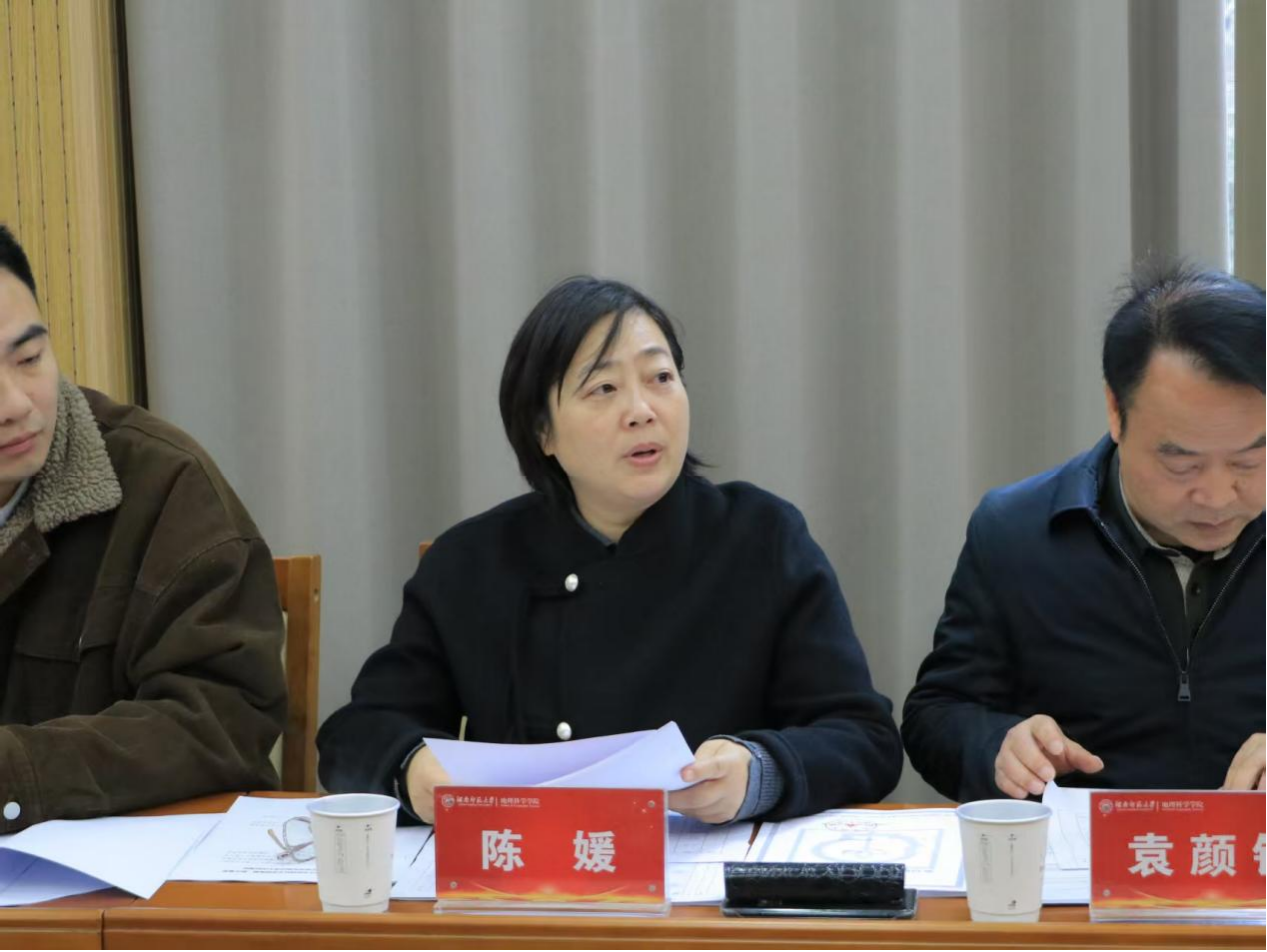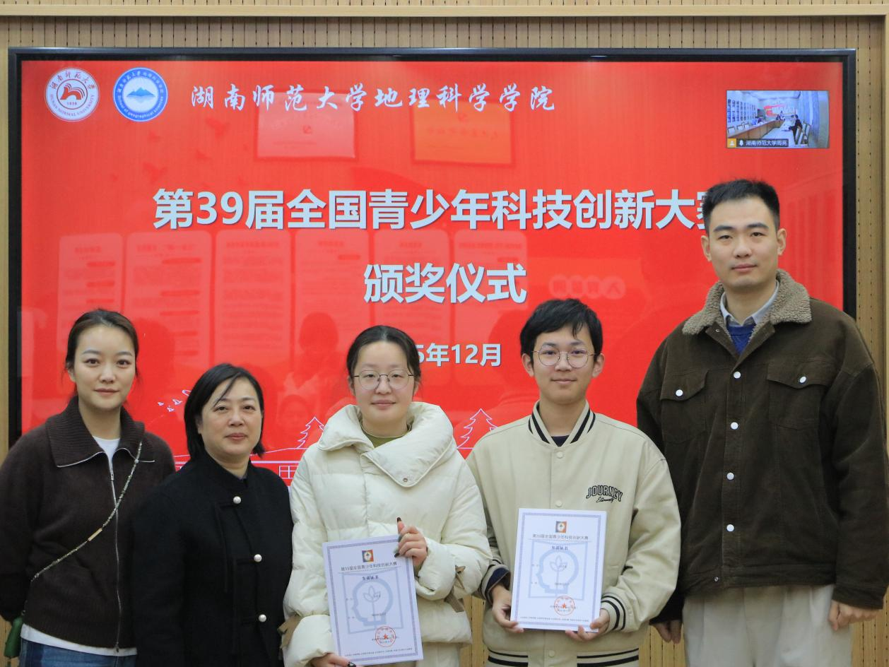 仪式伊始,陈媛首先向获奖的文靖灵、彭浩原两位同学表示祝贺,祝贺两位同学的作品凭借优异表现脱颖而出,在第39届全国青少年科技创新大赛中举得优异成绩。她指出该赛事由中国科技协会、共青团中央、中国地理科学学会等单位联合主办,具有深厚的历史底蕴与高含金量。此次颁奖是受中国地理学会委托为两名学生颁奖,希望借这场简约而庄重的仪式,传递对获奖学子的肯定。随后,陈媛与院学工办老师依次为文靖灵、彭浩原同学颁奖并合影留念,勉励他们再接再厉,再创佳绩。